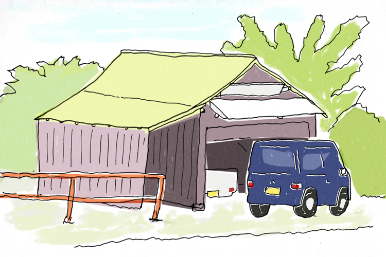 ペンのスケッチに色を付けてみた。フラットになっちゃったけど実際は屋根も壁もトタン。実際は後ろに山が広がっている。この日はお休みのようだったけど「篠原の里」のすぐ目の前です。